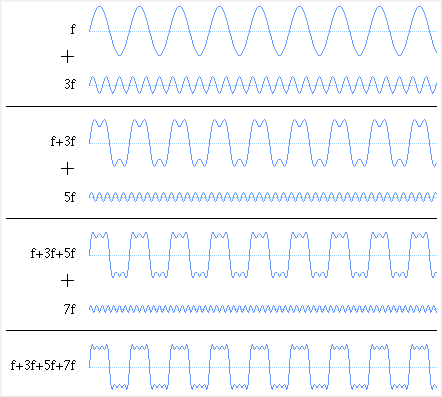 A square wave can be constructed from multiple sine waves at different frequencies. The sine waves added in addition to the fundamental frequency are called harmonics; a square wave has harmonics at odd multiples of the fundamental frequency. As higher harmonics are added, the result gets closer to an ideal square wave, which contains infinite harmonics.